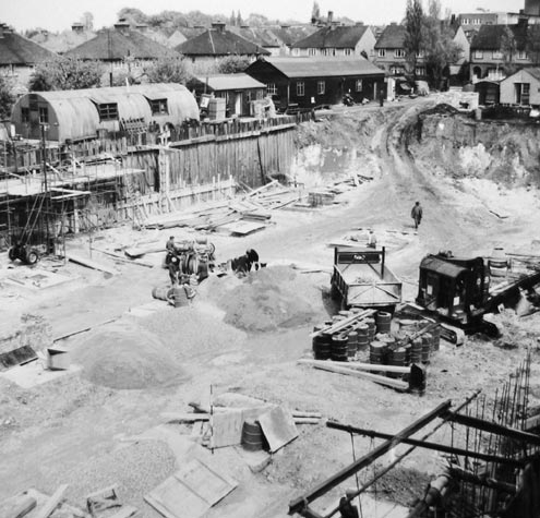 October 1955. Overview of the excavated site as seen from the Sydney Road works entrance by Whippendell Road. The girders for the new Process Block are going up against the old Machine Room, at the far end of the excavation. On the left is the Engineering “Top Shop” (backing onto the boiler house, which is adjacent to the railway line).